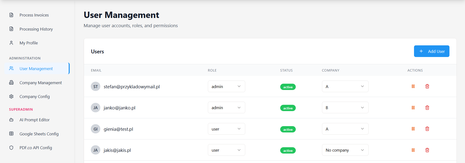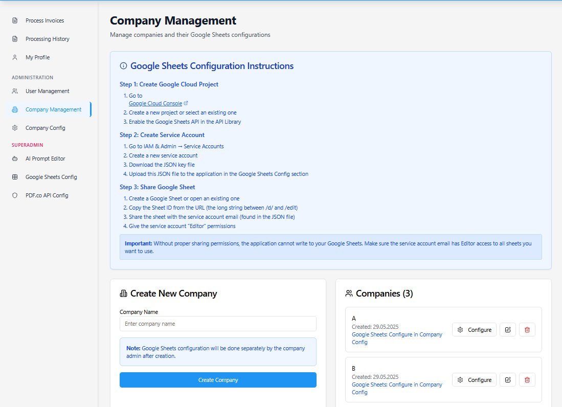 Includes a full user management system with roles for Superadmin, Admin, and User, supporting company management, customizable LLM prompts, and Google Sheets integration.