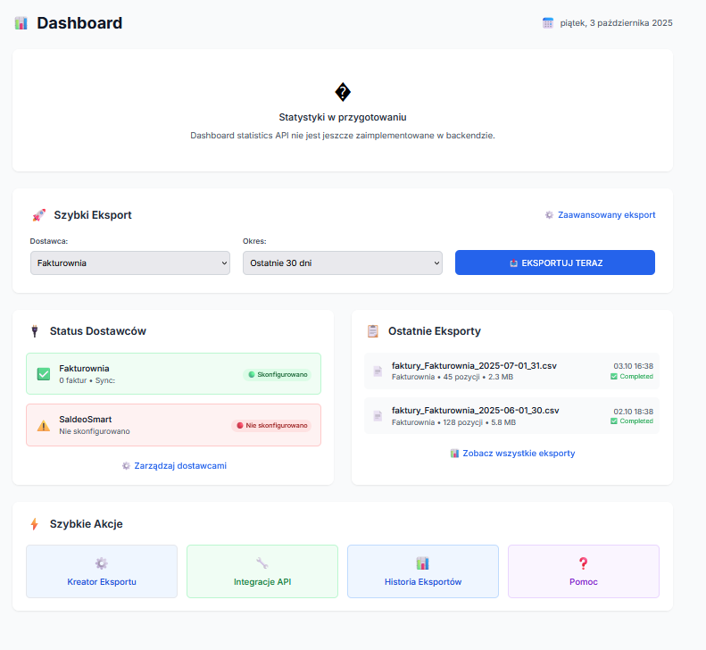 A PoC of a lightweight ASP.NET application designed to simplify invoice data management, created for a controlling company. It connects with Fakturownia.pl via API, allowing users to securely store their API keys, log in, and export invoice data to CSV files. With customizable export settings – including format, headers, and date ranges – the app adapts to your workflow. Built as a Proof of Concept, the solution is ready for future expansion, including integrations with platforms like SaldeoSmart and potential connections to data visualization tools for deeper business insights.