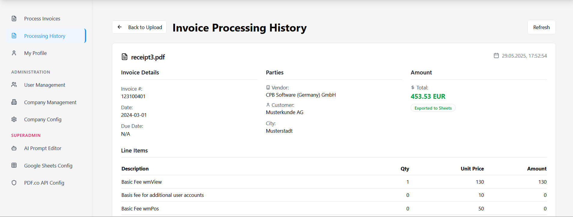 A PoC web app for automated invoice processing, integrating pdf.co API, LLM (Gemini), and Google Sheets for flexible setup and centralized management.