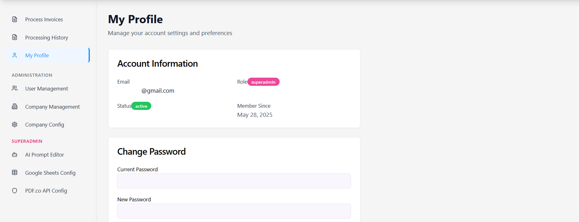 Includes a full user management system with roles for Superadmin, Admin, and User, supporting company management, customizable LLM prompts, and Google Sheets integration.