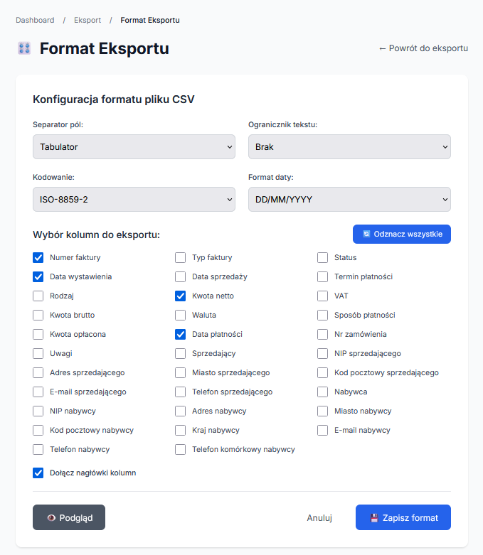 A PoC of a lightweight ASP.NET application designed to simplify invoice data management, created for a controlling company. It connects with Fakturownia.pl via API, allowing users to securely store their API keys, log in, and export invoice data to CSV files. With customizable export settings – including format, headers, and date ranges – the app adapts to your workflow. Built as a Proof of Concept, the solution is ready for future expansion, including integrations with platforms like SaldeoSmart and potential connections to data visualization tools for deeper business insights.